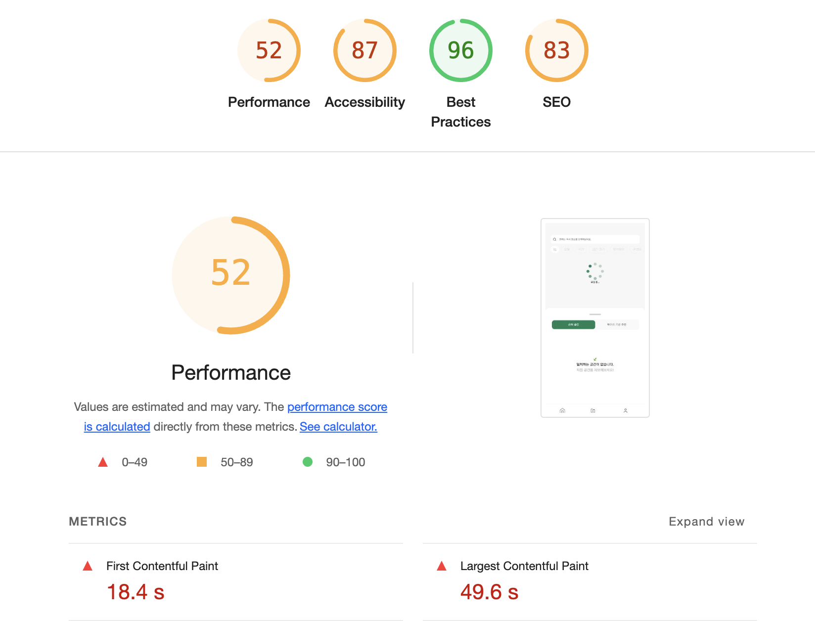 이렇게 코드 분할과 지연 로딩을 적용했지만, 여전히 각 번들의 크기가 최적화되지 않은 상태였다. 빠른 로딩을 위해서는 각 번들의 크기도 최적화할 필요가 있었다. 실제로 번들의 크기가 클수록 다운로드와 파싱, 실행하는 데 더 많은 시간이 걸리기 때문이다.