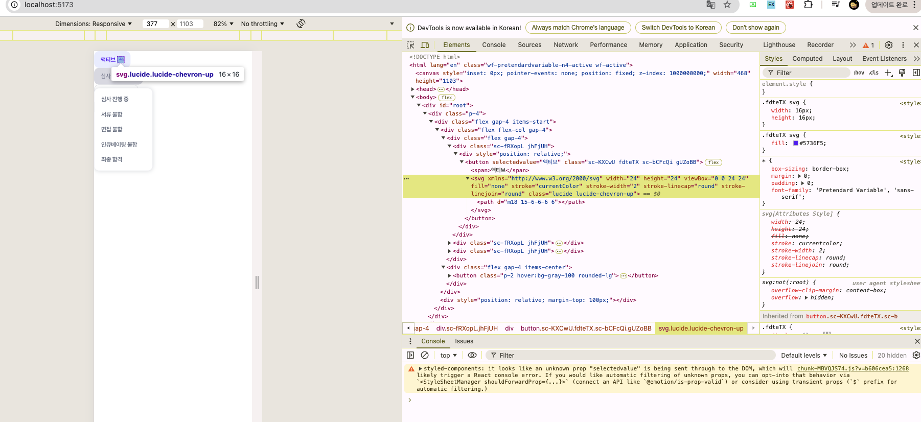이런식으로 아이콘이 겹쳐서 나타나는 문제이다. ChevronUp 아이콘 뒤에 세모난 무언가… 보이는가?!!