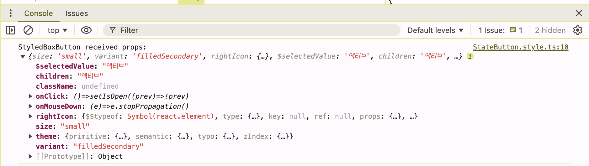 1. `StyledBoxButton`이나 `BoxButton`을 렌더링할 때 `props`를 `console.log`로 출력