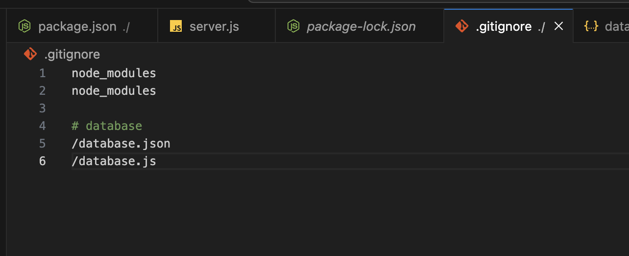 database.json이나 database.js에 데이터베이스의 hostname이나 password를 적어야 하는 경우가 있는데 깃에 연동해둔 프로젝트의 경우 개인정보 보호를 위해 gitignore에 파일을 추가해서 정보가 유출되지 않게 해준다.