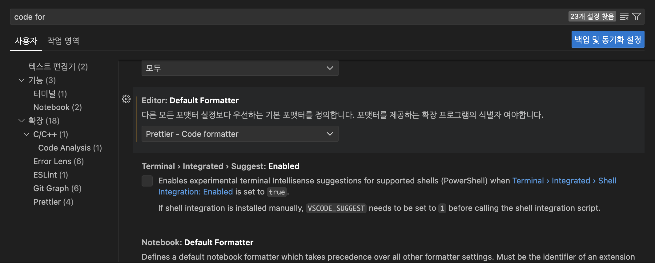 1. 설정의 Default Formatter를 prettier / eslint로 둔다
