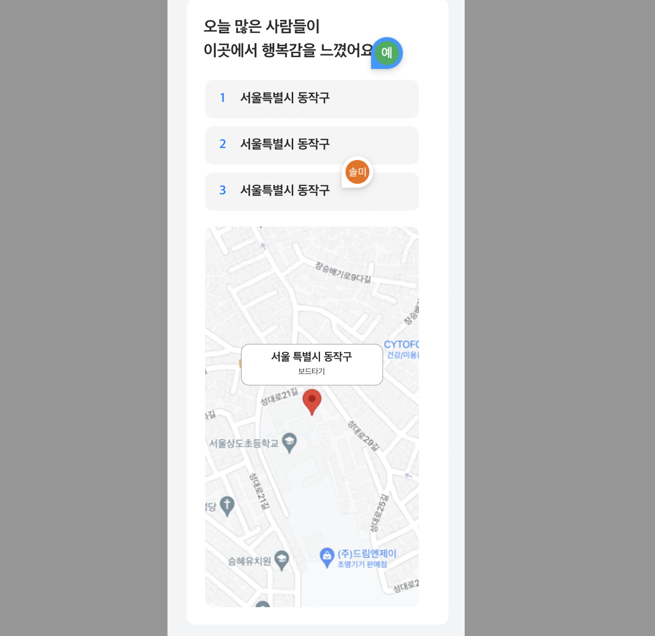 빌드 후 구글 지도가 안보이는 문제이 문제는 구글 맵 api 키를 환경 설정에 등록을 안했기 때문입니다!!!api 키 발급받아서 app.json에 추가해주면 빌드 후에도 정상적으로 지도가 뜹니다!! 밑에서 확인하세요구현하고 싶은 것서버에서 위도와 경도를 받아와서 해당 지역을 지도로 보여주는 기능을 구현하고 싶었다. 이런 느낌으로! 지도표시 + 해당 위치(1위) 마커 + 간단한 설명 + 1, 2, 3 순위 클릭 시 하단 지도에 위치 보여주기요 정도를 구현 할 예정이다.구현 할 것1. 지도 라이브러리 선택하기2. 서버로 위도 경도 받아오기3. 해당 위치 지도에 마커로 띄우기 사실 할 건 별로 없다! 다만 지도를 쓰기 위해 api키를 발급받고 설정하고 그런 귀찮은것 들이 존재할 뿐!!!구현 방법1. 지도 라이..