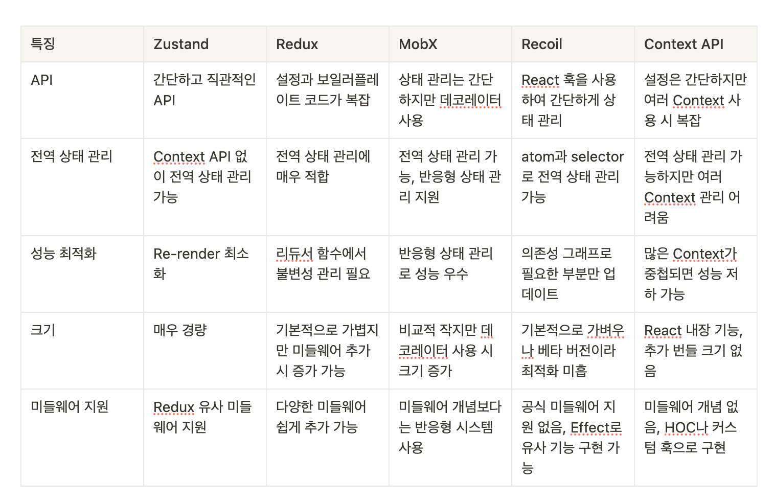 현재 개발중인 프로젝트에서 상태관리로 zustand를 사용하기로 했다.recoil충이었던 내가 zustand를?!!익숙해지기 위해 이론과 간단한 todo list를 만들어서 직접 사용해보자!왜 이렇게까지 하냐면,,, 코드 잠깐 봤는데 한 번에 이해가 안돼서 직접 써봐야겠어서,,, 핳머리가 나쁘면 몸이 고생한다는 걸 하 머래 난 말이 너무 많아그냥 빨리 해보자Zustand 관련 내용 정리Zustand란?- React의 상태 관리 라이브러리이다. Zustand는 독일어로 "상태"를 의미해서 이런 이름이 붙었다고 한다 주요 특징1. API 설정이 간단하다.2. 경량 라이브러리이다.3. Redux 미들웨어와 유사하게 미들웨어를 사용할 수 있다. 이왕 정리하는 김에 정리해본...주요 상태관리 도구들 특징 비교z..
